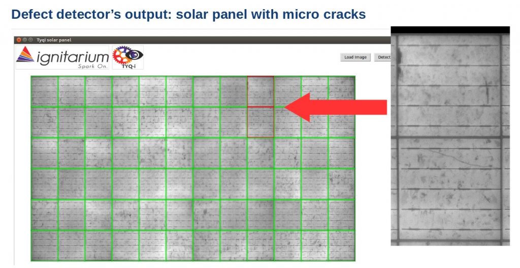 So we have successfully tackled problems from various industries like transportation, footwear and food processing. But the examples don’t stop here. We are also working in the energy sector. Usage of renewable energy sources like solar power is increasing even in developing countries. Solar panels are made of numerous solar cells. There are a number of defects which can be visually detected such as micro-cracks, scratches, cross-cracks and more. Typically, an electroluminescent camera is used to capture the images of solar panels. Enter our custom processing chain which detects the area of the whole panel, separates out individual cells and then classifies the type of the defect.