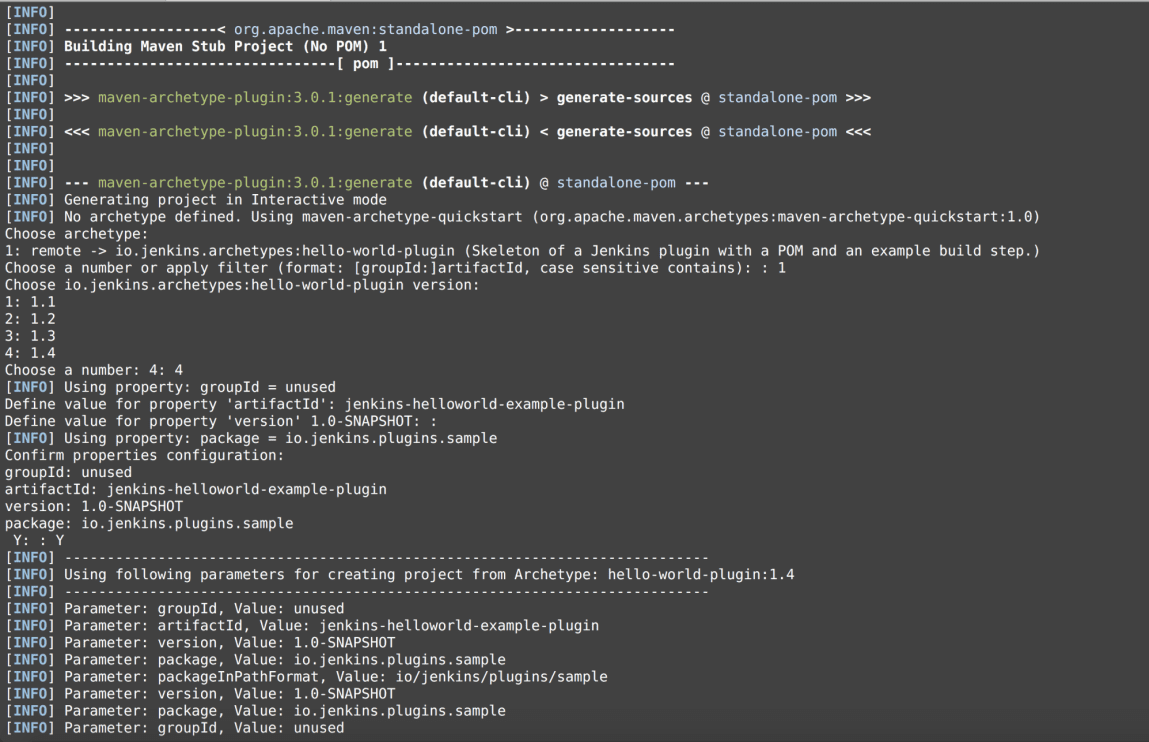 Notice here that 1 is entered for the archetype, a plugin version of 4 is chosen, and a value of jenkins-helloworld-example-plugin is defined. Hit Enter for the default values: