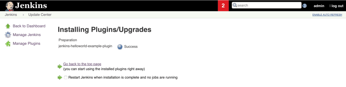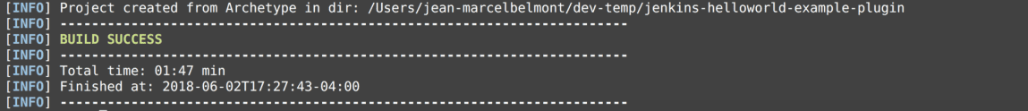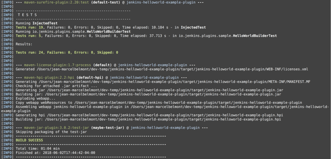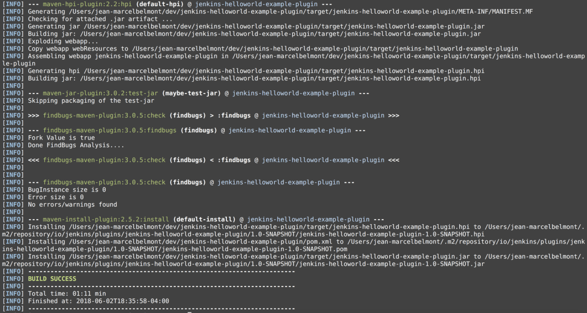 The mvn install command will both build and test the Jenkins plugin and, more importantly, create a file called pluginname.hpi. In this case, it will create a file called jenkins-helloworld-example-plugin.hpi in the target directory that you can use to deploy to Jenkins.
